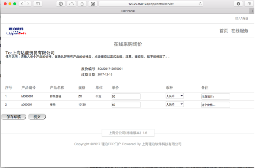 在EDP Connect在线链接页面,可以输入要发送给的供应商,以及有效时间。然后可以将这个链接生成通知邮件给供应商。 供应商点击链接,回填采购询盘 供应商收到这个邮件,就可以点击EDP Connect 生成的链接,出现如下页面。供应商可以输入单价,以及备注信息。 然后提交提交,在线采购询价就正式提交到理泊EDP系统中。