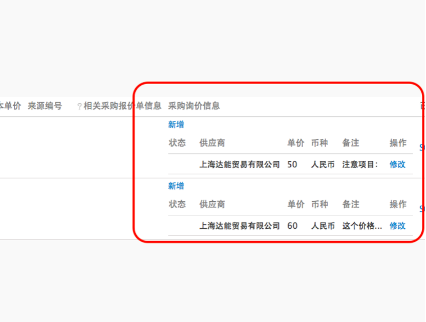 业务人员比较价格信息,确定供应商 业务人员在销售报价单的详细页面的产品行,就可以看到供应商提交的价格信息。